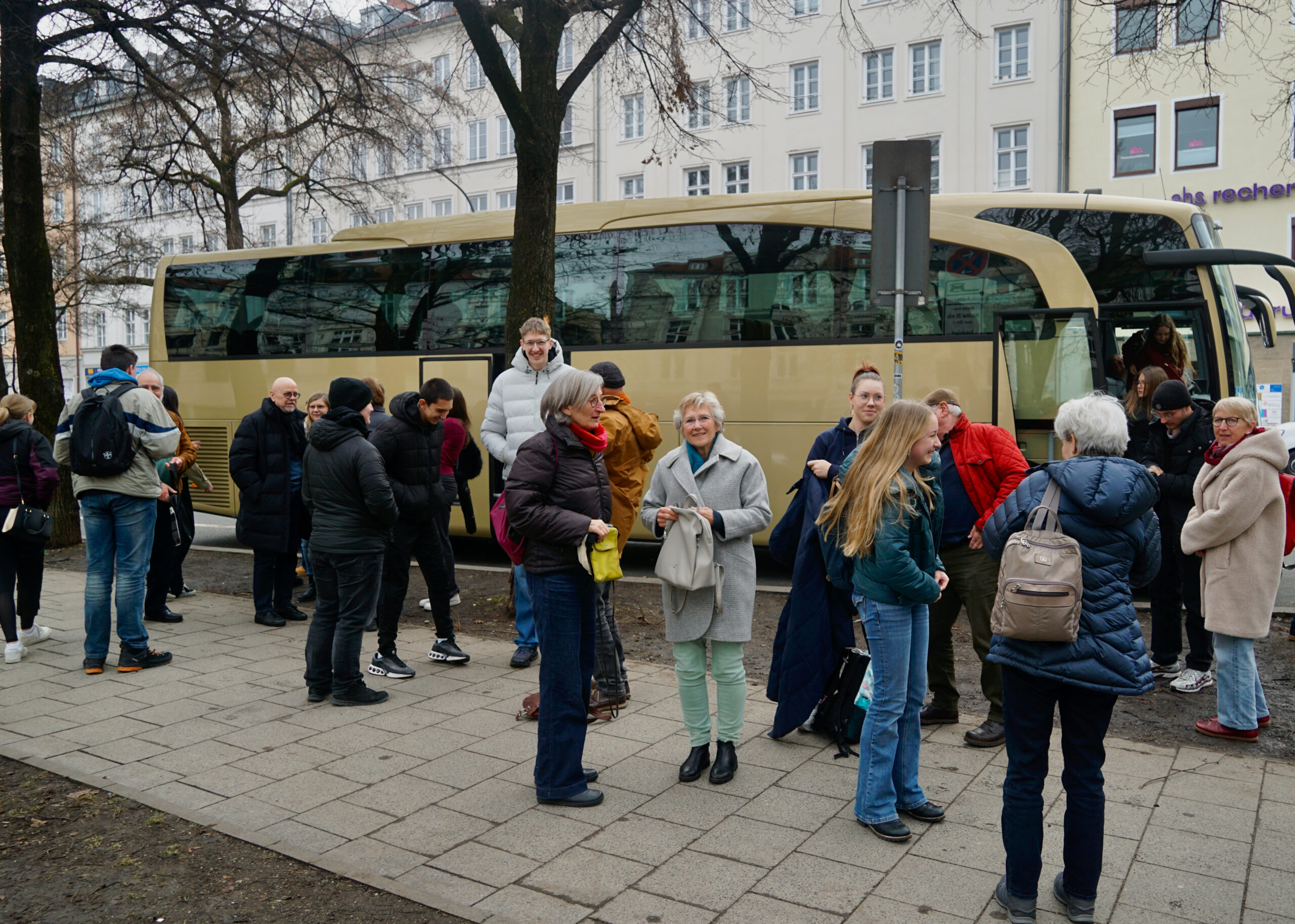 23 Schülerinnen und Schüler (8 vom Gymnasium Bad Aibling, 5 von der Wirtschaftsschule Alpenland, 3 von der Wilhelm-Leibl-Realschule und 7 von der St. Georg Mittelschule) und Erwachsene unterschiedlichsten Alters, fuhren in ausgelosten Tandems gemeinsam im Bus nach München.